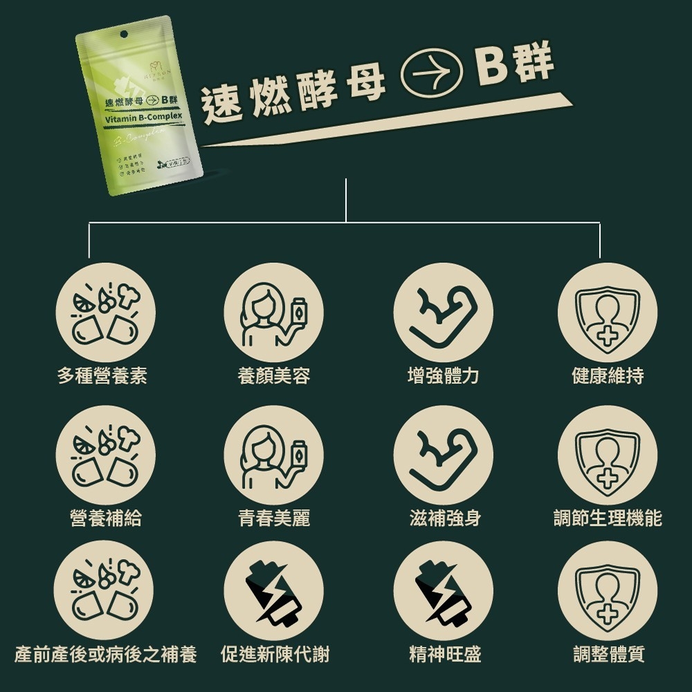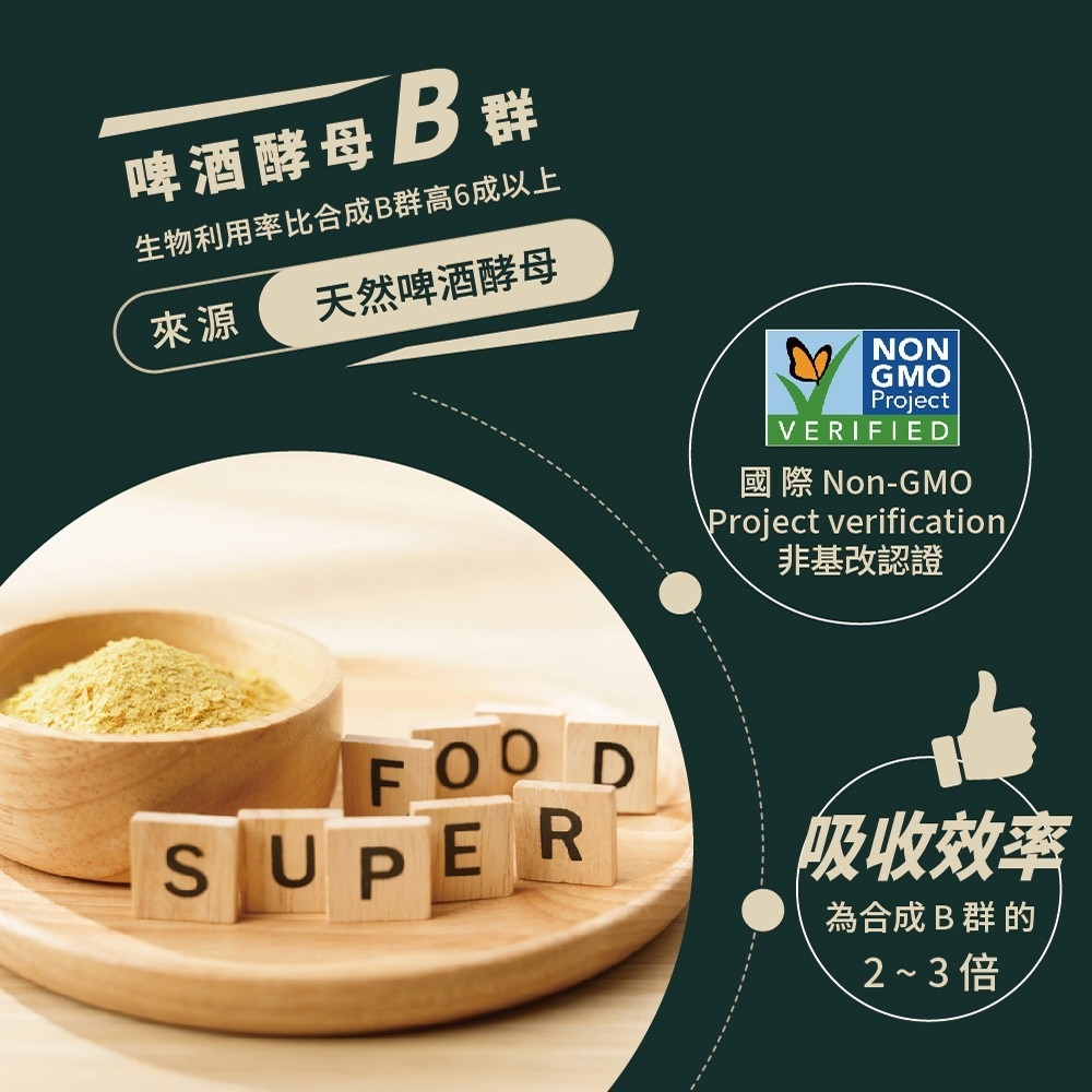 嚴選天然啤酒酵母來源B群,通過非基改驗證,搭配綜合礦物質與98種蔬果酵素精華,打造高吸收、無刺激的能量補充配方。
